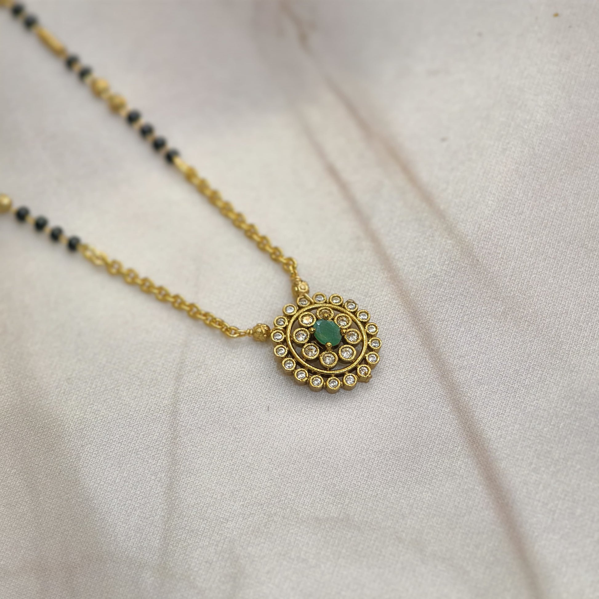 Short black beads in the length of 16 inches.along with green and white stone combination pendant.simple and cute.neat look.