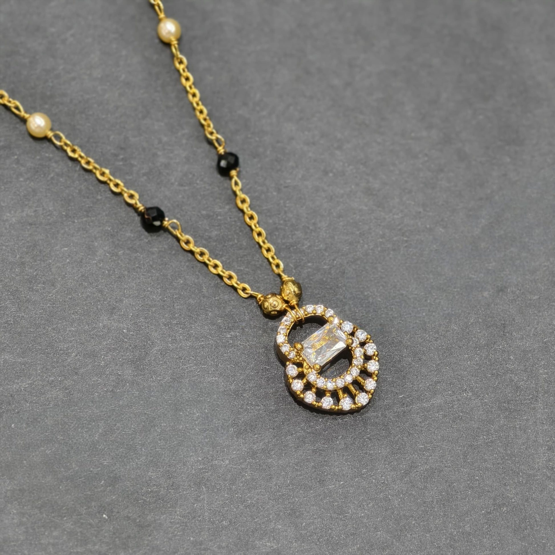 Short black beads with white stone pendant.swaroski and black manulu combination.