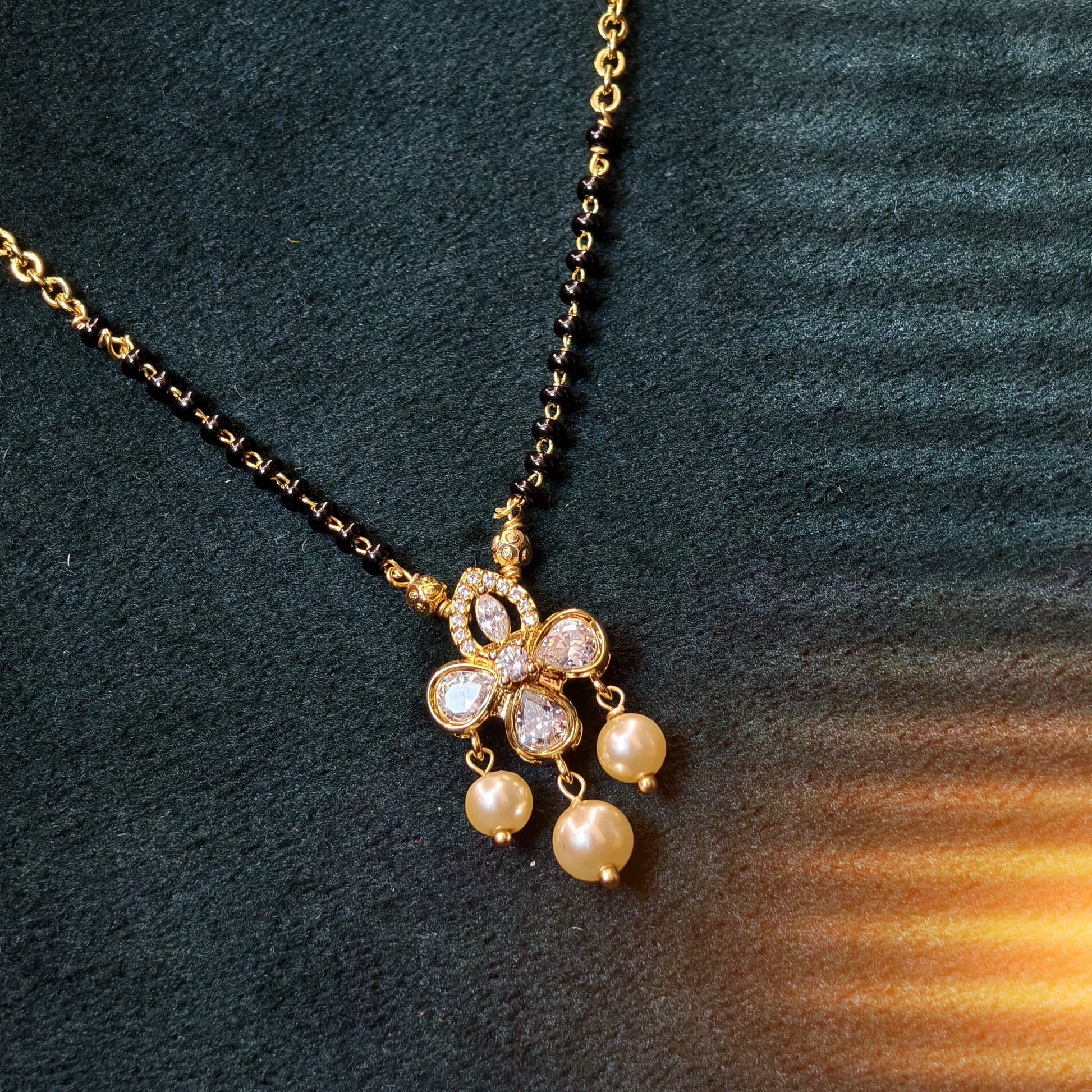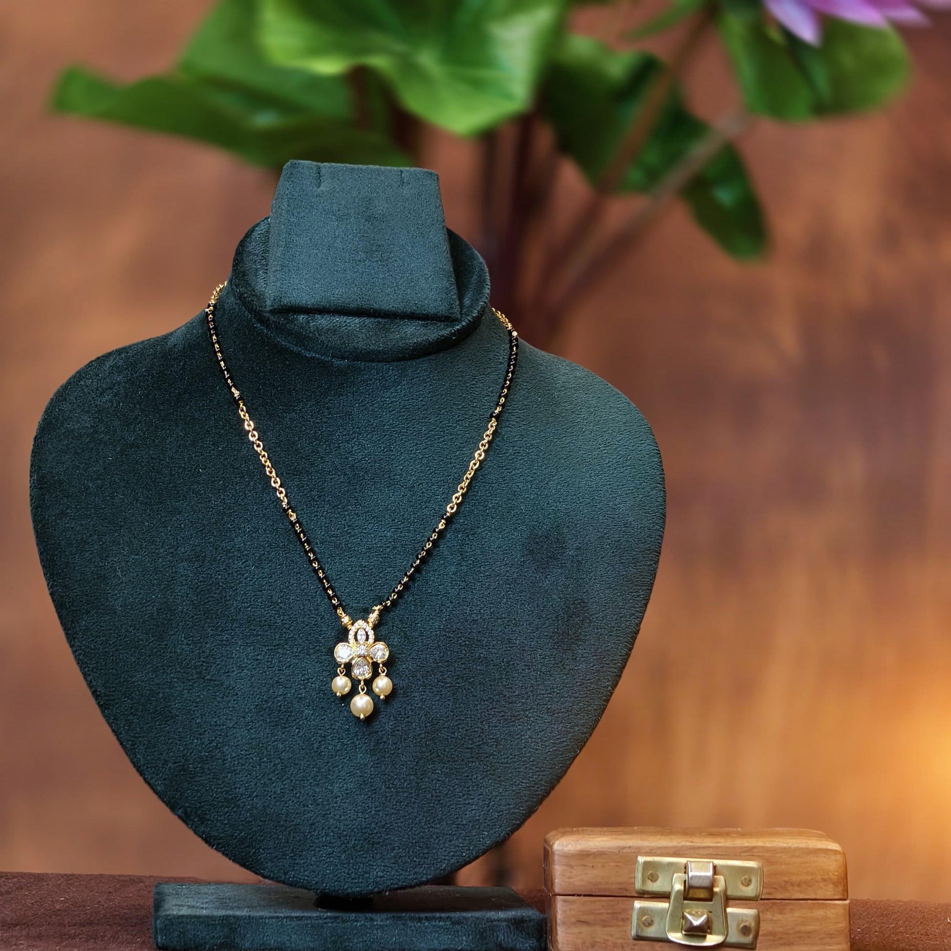 Short black beads in chain and beads pattern with beautiful white stone work pendant and three Swarovski pearls in the length of 16 Inches.