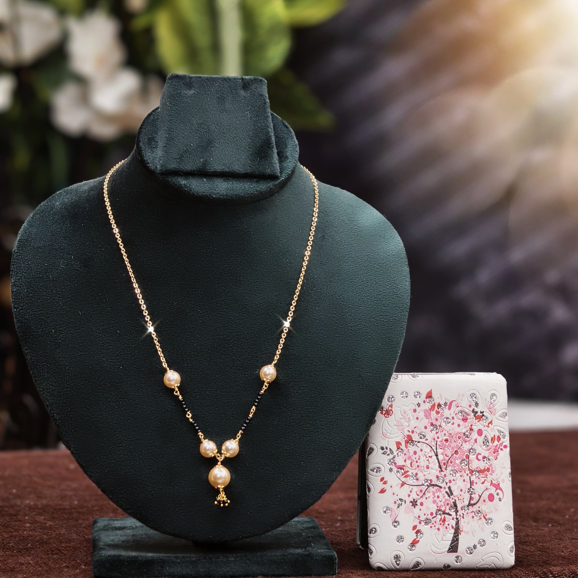 Short black beads with premium quality chain and beads with 5 Swarovski pearls in the length of 16 inches.