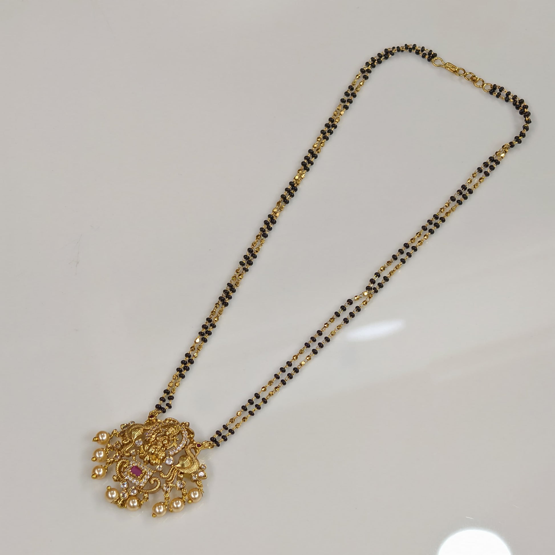 Sleek pattern black beads with Laxmi pendant with peacock pattern.white and pink colour combination..