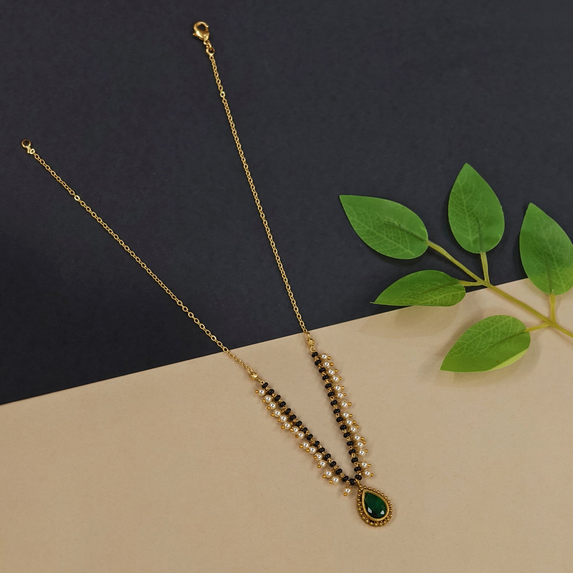 Black beads with Swarovski pearls and emarald stone. Length of 16 inches.