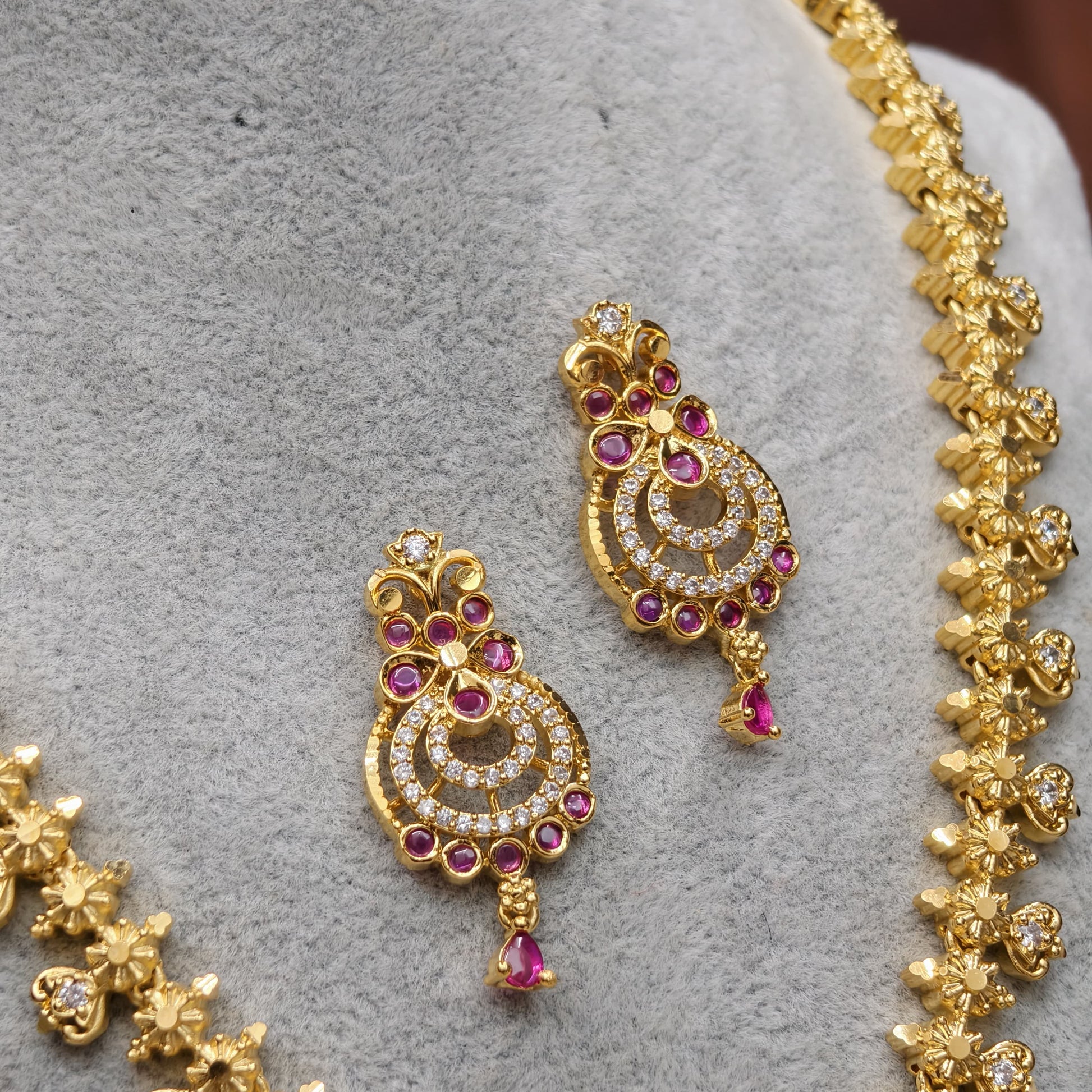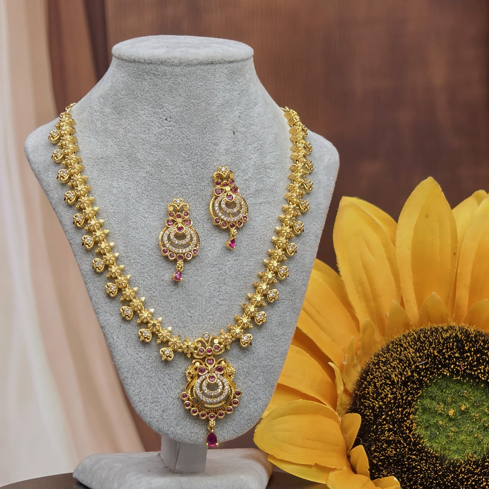 New pattern short neck set in micro gold finishing with earrings.It matches the micro gold long harams