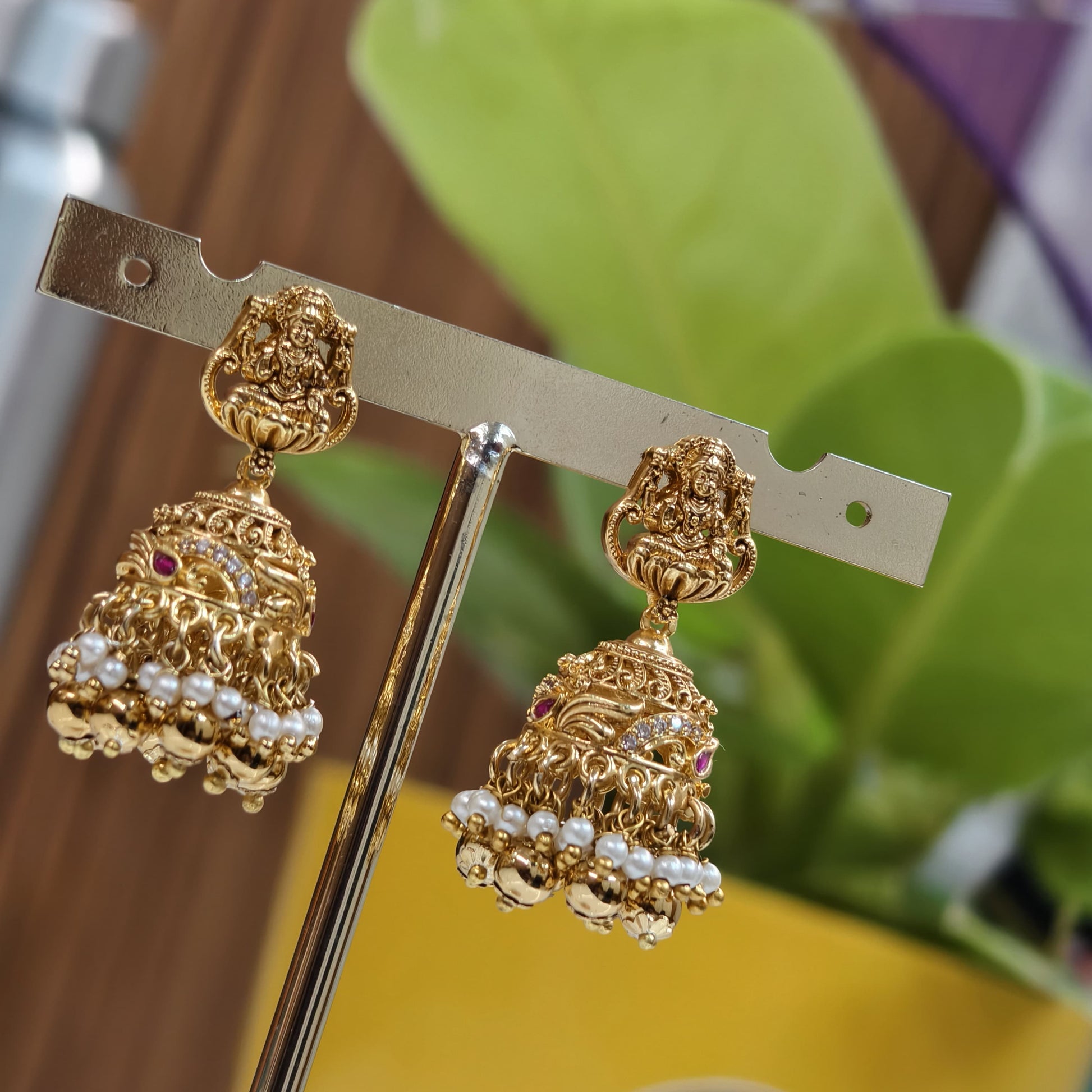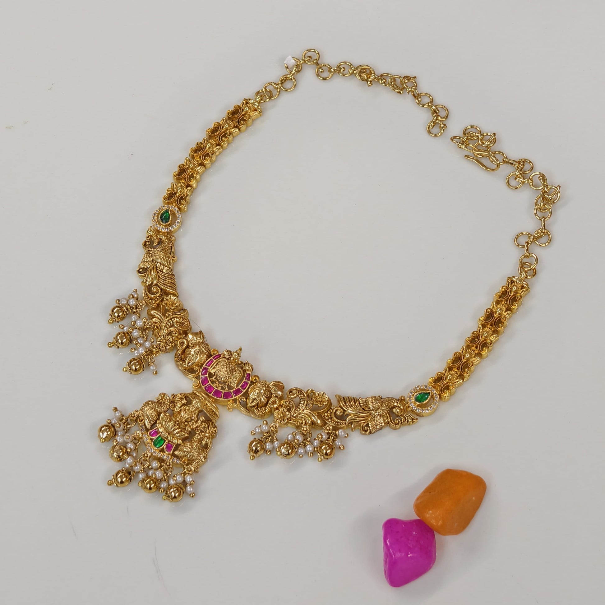 Nakshi finishing short and 3d pattern neck set along with back chain.green and pink stone combination with Earrings.