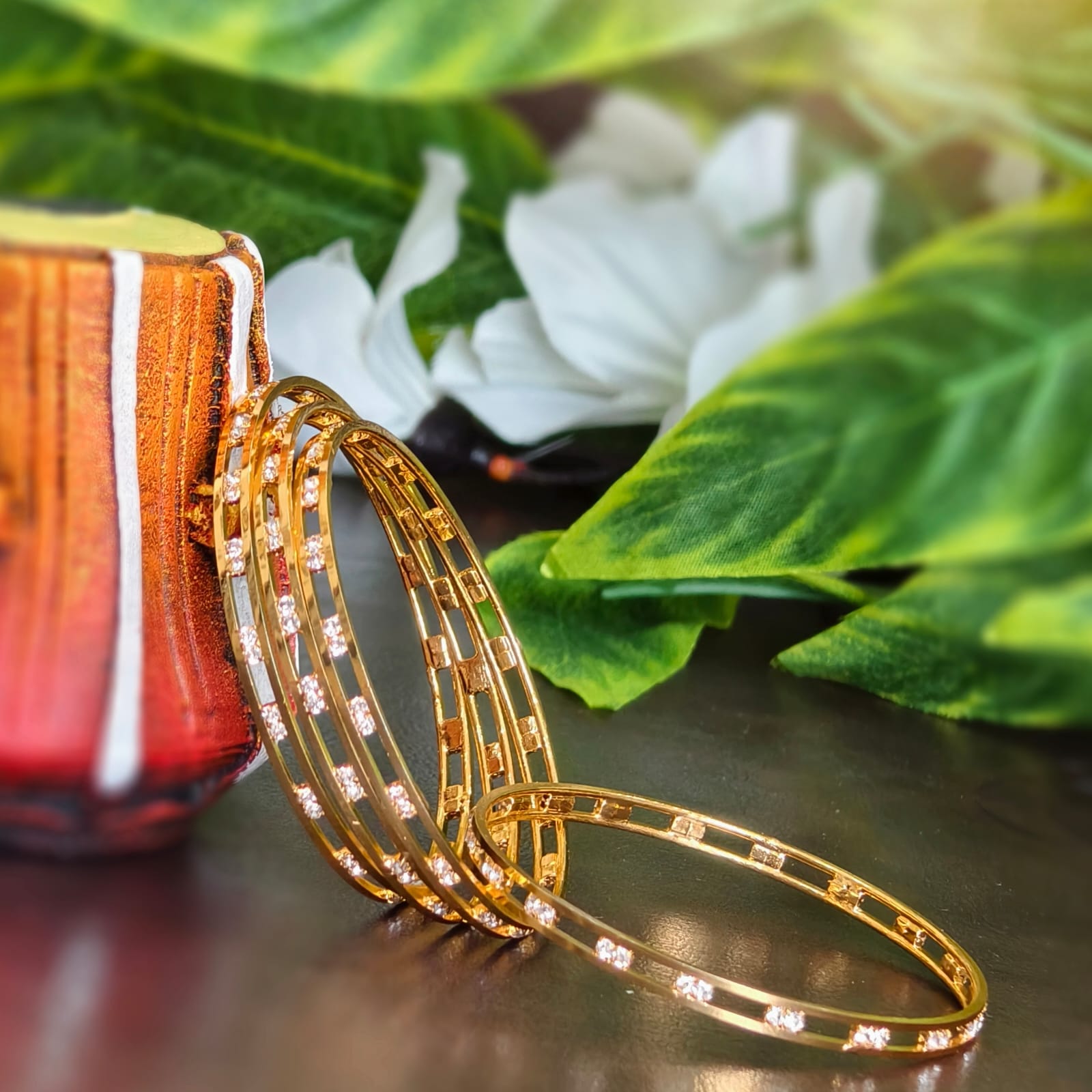 Whites stone bangles in the size of 2.8 in micro-gold finishing.simple and elegant look.