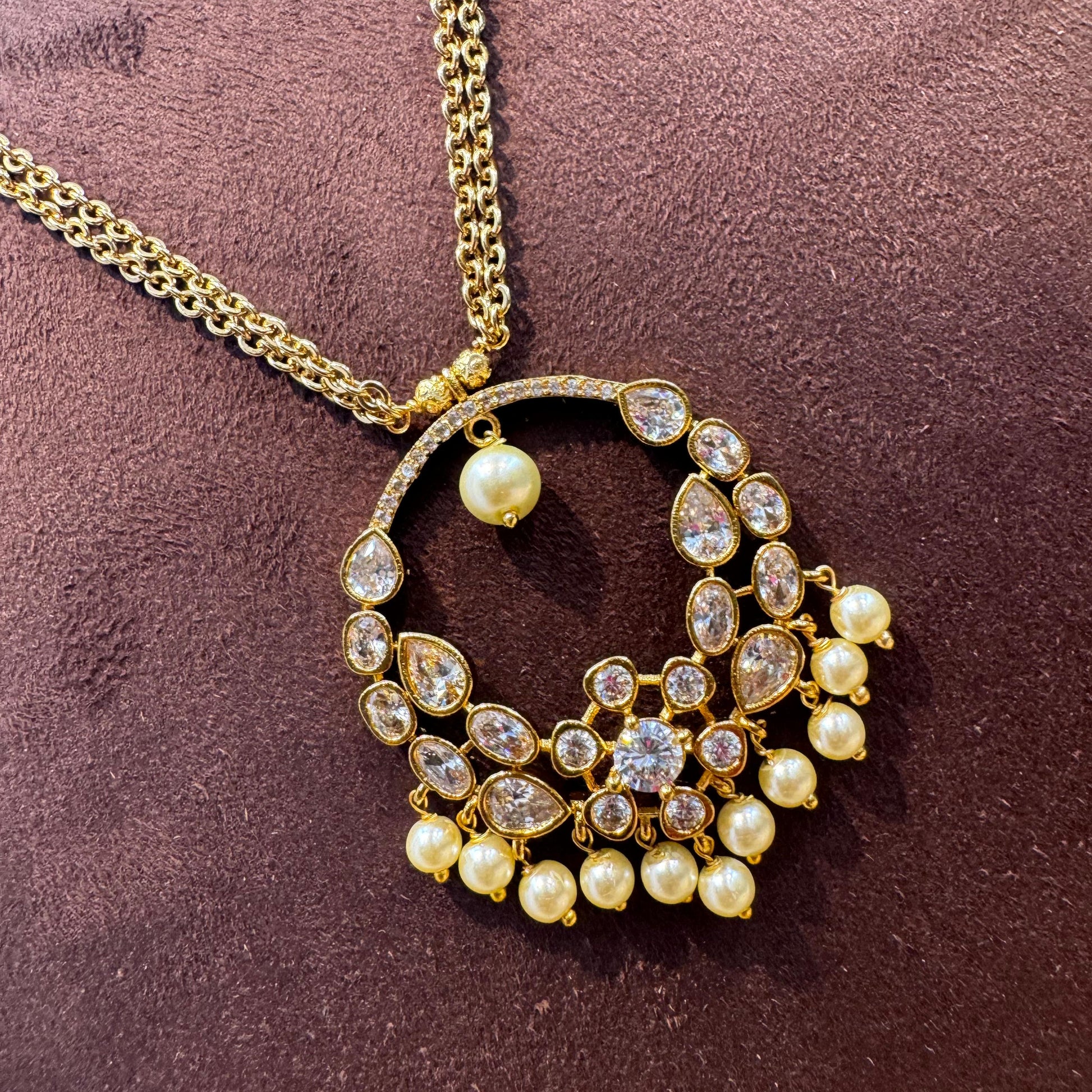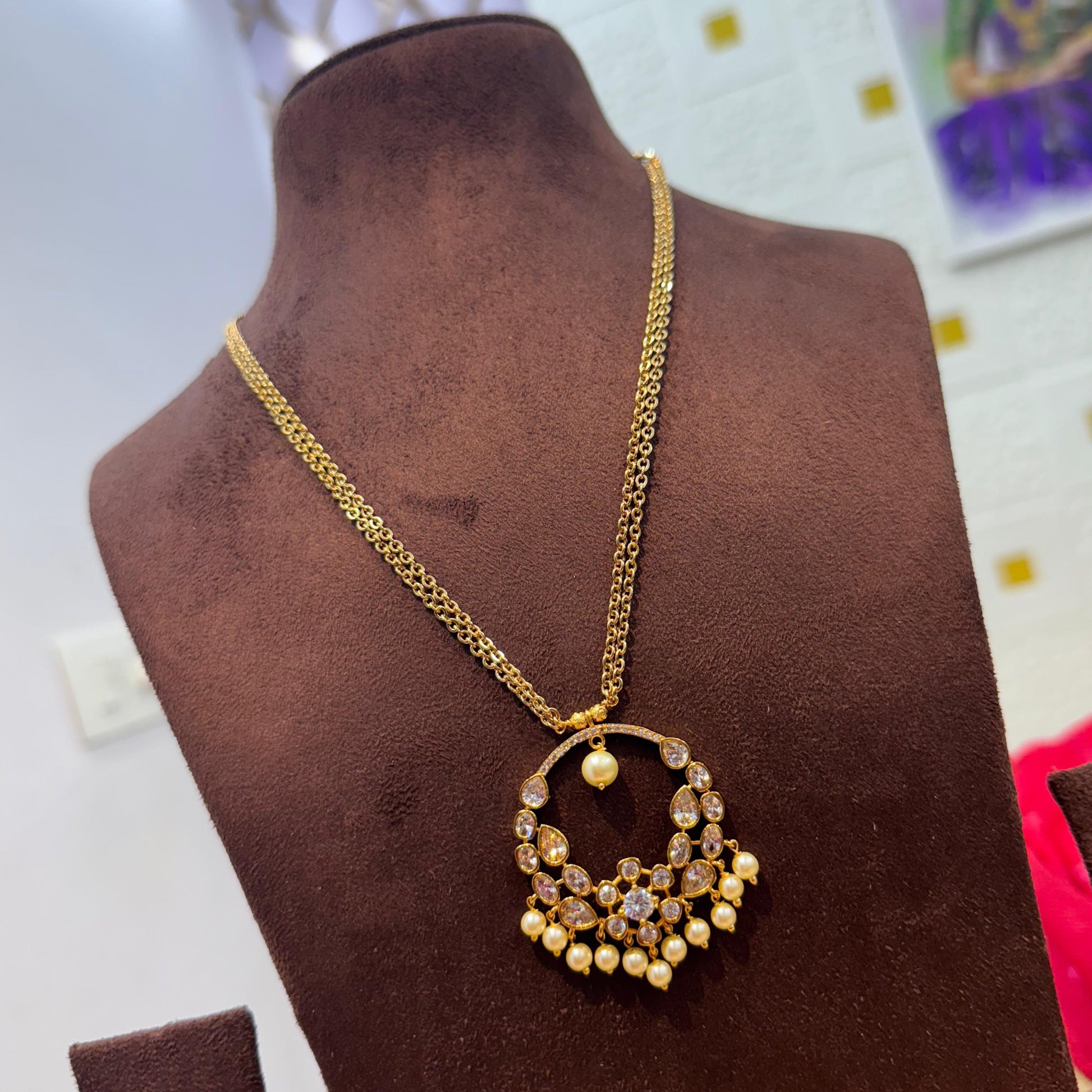 Display your elegant, professional style with our uncut pendant and Chandraharam set. This 24 inch chain is the perfect accessory for office wear, adding a touch of sophistication to any outfit. The uncut design adds a unique touch, making you stand out as a fashion-forward expert in your workplace.