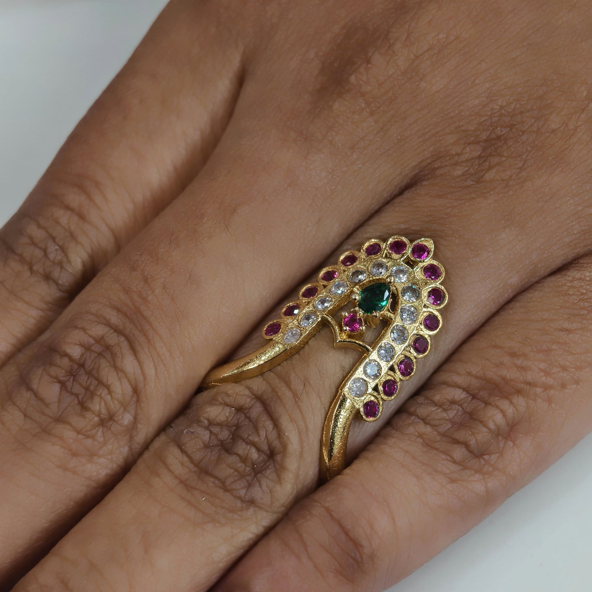 Panchaloham vanki ring in flower pattern pink,green and white stone combination.